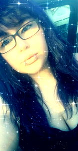 A close-up portrait of a woman with purple hair, tattoos, and a hoop nose ring. She has a subtle smile and is wearing a light blue shirt with a neckline. The background appears to be indoors with soft lighting.
