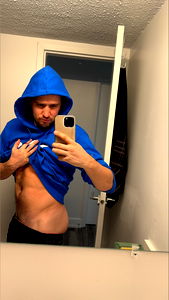 A person taking a selfie in the mirror while showcasing a fit physique. The individual is wearing a blue hoodie and appears to be in their late twenties or early thirties. They have short hair and are holding onto their chest with one hand, drawing attention to it.