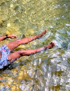 The image portrays a man immersed in the water, capturing the essence of relaxation and adventure. The natural surroundings suggest a peaceful and serene environment for leisure and exploration.