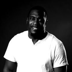 The image shows a man standing in profile against a black background. He is wearing a white t-shirt and has a beard. His left hand is slightly raised near his head. The background behind him appears to be a plain black surface. ๐ Top 5% Photographer from Maryland, New York, Philadelphia, DC, NJ, VA.