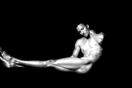 The image portrays a highly muscular man who is likely a bodybuilder, given the extreme definition and size of his muscles. He is shirtless, revealing his bare chest, stomach, and abdomen, which are all exceptionally toned and developed. His physique is reminiscent of a bodybuilding competitor, with every muscle group distinctly visible, including his abs, chest, and even his elbows and other joints. The man is also wearing a pair of undergarments, possibly briefs or swim briefs, that sit low on his waist. This piece of clothing enables a full view of his navel and lower abdomen. The focus on his torso and the minimal clothing suggest that this image might be related to fitness or bodybuilding media. His physical fitness and bodybuilder status are emphasized, and his confident presentation in minimal clothing suggests comfort with his body and physical achievements. Overall, the image exudes a sense of strength, dedication, and intense physical training.
