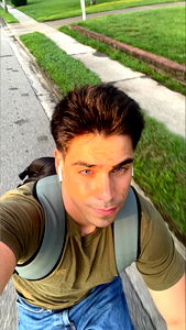 A selfie of a young man in a pink shirt, smiling confidently at the camera. He has short hair and is looking directly into it. His expression is friendly and approachable.