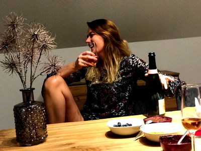 In this image, a young adult woman is captured in a joyful moment at a dinner table. She's sitting with a wine glass in hand, engaging in conversation with the person across from her. The scene suggests a casual and festive atmosphere, as evidenced by the bottle of champagne on the table and the relaxed posture of the woman.
