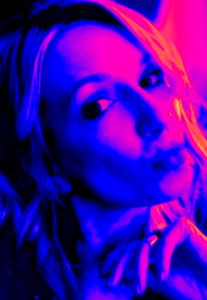 A captivating and colorful photo of OnlyFans model Stevie Love from Hot Springs, AR. The image features a woman with a confident gaze, standing against a vibrant purple backdrop, with pink and blue lights adding to the dynamic atmosphere. Her pose suggests a sense of freedom and self-expression.