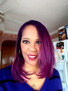 Jerrie, the creator of Str8Isis, a platform dedicated to straight queens. Jerrie is standing in a kitchen with vibrant purple hair and a bright smile. She's wearing a striped shirt that matches her lively personality.