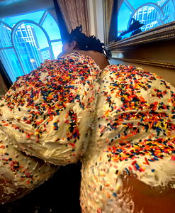 This image captures a delightful, indoor setting where a variety of baked goods are artistically displayed. The eye is instantly drawn to the meticulously decorated desserts, their vibrant colors and textures suggesting a deliciously sweet taste. The main focus is on food, specifically baked goods including cupcakes, cookies, and possibly donuts. The baked goods are adorned with nonpareils and sprinkles, adding a whimsical touch and indicating that they might be enjoyed as a snack or dessert. The baking process seems to have just been completed, as suggested by the freshness of the baked goods and the organized mess of a baking endeavor. One can almost smell the warm, comforting aroma of the freshly baked goodies. The scene is further enhanced by the large window in the background, allowing natural light to spill into the room and illuminate the decadent treats. This setting evokes a sense of comfort, warmth, and joy, typical of a homey bakery or a cozy kitchen. The image is a celebration of baking, the art of decorating food, and the pleasure of enjoying these delightful treats.