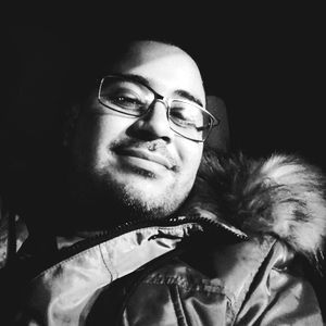 A man with glasses, sporting a beard, sits in the back seat of a car during nighttime. He appears relaxed and is looking towards the camera.