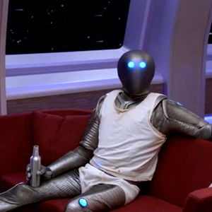 A professional model, dressed in a futuristic outfit and sitting on a red couch in a science fiction setting.
