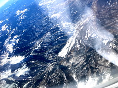 An incredible perspective from an airplane window showcases the vastness of our planet, with a snowy mountain range and a clear blue sky. This image evokes a sense of wonder about the beauty and complexity of our home planet.