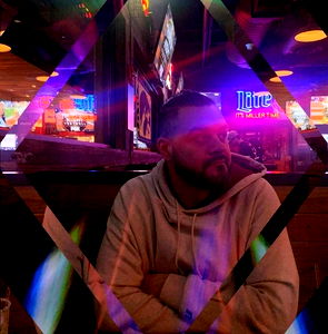 The image shows a person sitting at a table, with a contemplative expression. The individual appears to be engaged in their surroundings, possibly working or studying. They are wearing a white top and have short hair. The background features a wall with a patterned design and what looks like a kitchen area to the right.