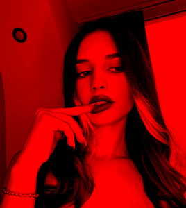 This image captures the striking and bold aesthetic of OnlyFans model Eniafree. With a single, powerful finger gesture, she commands attention in her vibrant red outfit. Her gaze is intense, adding to the overall impactful of the photo.
