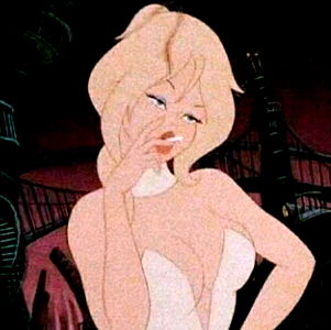 A stylized character reminiscent of classic animation, featuring a blonde woman in a white dress holding a cigarette to her lips. The illustration is in a limited color palette that enhances its retro appeal.
