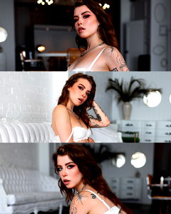 This is an indoor portrait of a young female model, estimated to be around 23 years old. She poses artistically against a wall, on the floor, showcasing a bold and confident personality. Her striking facial features, with a well-defined jawline and expressive eyes, are the focal points of the image. She is dressed in alluring lingerie, which accentuates her toned abdomen, chest, and thighs. The lingerie is not just a piece of clothing in this image, but an essential element that adds a dose of sensuality to the overall composition of the photo. There's a hint of rebellion in the form of a tattoo, although it's not clearly visible. The setting has a boudoir vibe, adding to the intimate atmosphere. The lighting in the room casts soft shadows that highlight the model's physique, enhancing the overall aesthetic appeal of the photograph. This seems to be a professional photo shoot, possibly for a fashion or art project. The model's calm demeanour and poised stance hint at her experience and professionalism.