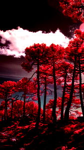 Experience the tranquility of Scarlett's enchanting redwood forest. Witness the mesmerizing blend of warm and cool hues from the rich red of the trees against a serene gray sky, creating a harmonious symphony of nature's beauty.