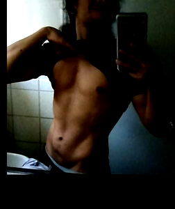 An image of an athletic male flexing his muscles while taking a photo of himself. He is shirtless and appears to be in his early twenties, showcasing his body fitness.