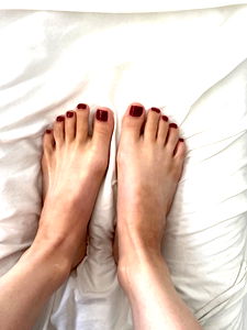 This is a close-up image of a person's bare feet resting on a bed, likely from a model shoot. The toes are spread out, and the person appears to be relaxed. The background is minimalistic, emphasizing the model's feet.