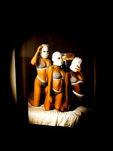 An intimate and artistic photoshoot featuring Symmoria, a popular Amsterdam-based model. The image showcases Symmoria posing in an elegant black lingerie with white lace accents, paired with matching gloves and a mask. The background is blurred, emphasizing the subject's allure. A mirror captures Symmoria's reflection, adding depth to the scene.