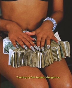 A model holding a stack of money with the caption Touching my first thousand changed me. by Your Internet Goth Friend ๐โ