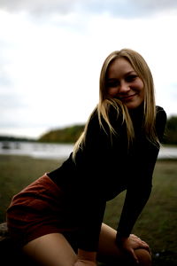 Taalyr, a model from Fort Frances, is captured in this image. She's seen posing for the camera with an expressive gaze and a slight smile. The backdrop of the photo features a serene lake and a clear sky, adding to the overall tranquility of the scene.
