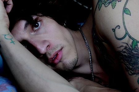 In this powerful photograph, OnlyFans model Tabris captures a moment of vulnerability and strength. Kneeling on the bed with his head resting in his hands, he exudes an air of deep contemplation. His tattoos are clearly visible, adding to his unique persona. The image is a testament to Tabris' ability to connect with his audience through his artistry and personal expression.