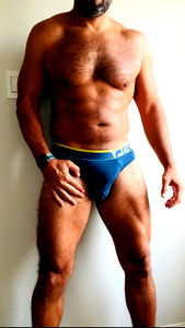 In this image, a muscular man is excellently showcased. He is standing indoors, against a neutral-toned wall that serves as a minimalist backdrop, allowing the viewer's focus to be drawn to him. The man has a notably chiseled physique, with his bare chest and abdomen revealing well-defined muscles, indicative of a dedicated bodybuilding regimen. His physical fitness and strength are further accentuated by his visible, firm biceps and elbows. He is dressed in a pair of briefs, also known as swim briefs or underpants, which are the only clothing items on his person. This choice of attire accentuates his muscular lower body, including his toned stomach and legs. The briefs appear to be more than just typical underwear; they seem to serve as a protective garment of sorts, potentially designed for physical activities. Although the man's facial features are not the central focus, his confident stance and posture suggest a sense of assurance and pride in his physique. The image is a powerful representation of physical fitness, strength, and commitment to bodybuilding.