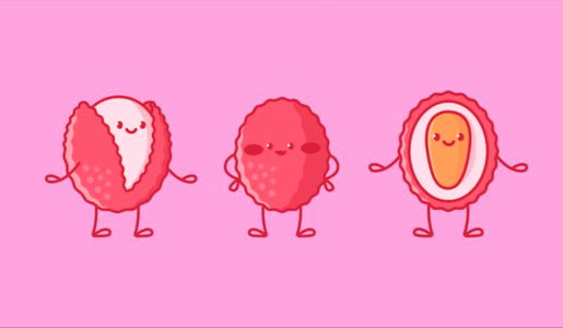 A colorful image featuring a fresh lychee with a single fruit, an apple slice, and a pink cherry blossom against a white background. The lychee is the central focus of the image, radiating warmth and health. It's a delightful visual representation of summer fruits.