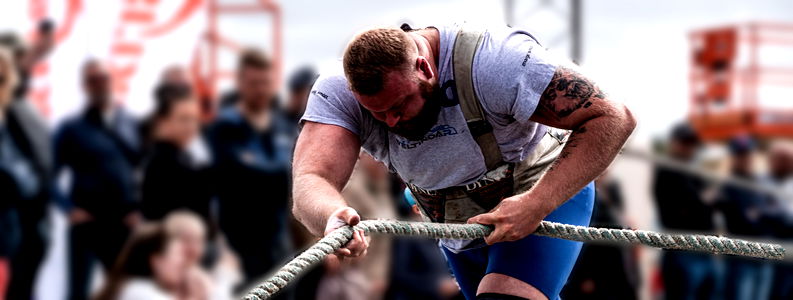 A powerful scene of a man in mid-action at the Icelandic Strongman competition, showcasing his strength and athleticism. Wearing a blue tank top and sunglasses, he seems to be lifting or pulling an object with intensity.