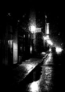 A solitary figure walks down a rain-soaked street at night, illuminated by the glow of store signs and the soft patter of falling raindrops. The scene exudes a sense of tranquility and introspection.