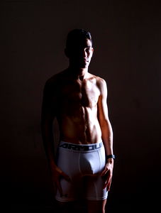 The image features a young man around the age of 22, displaying his well-developed muscular physique. He is seen shirtless, revealing his chiseled chest, flat stomach, and pronounced abs. His powerful shoulder and elbow joints suggest a robust upper body strength. He is wearing a pair of shorts or briefs, which might indicate that he is in his workout attire or leisurewear. The waistband of the shorts is visible, neatly hugging his waist, leading the eye down to his shorts, which are possibly made of a material typical of trunks or underpants. This could suggest that he is in an indoor setting, possibly a personal space like a bedroom or a workout area. He stands against a wall, which might be part of his home or a gym. His posture and the clothing he is wearing indicate that he might be getting ready for a workout or casually posing for the photo. Overall, the image exudes an air of fitness, health, and strength.