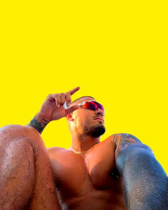 This image captures a man who commands attention with his muscular physique, showcased by his bare chest. He stands under the open sky, a testament to his freedom and strength. The details of his well-built upper body are impressive, revealing the results of his fitness regime and discipline. His strong chest and defined muscles are a focal point, reflecting his physical prowess and healthy lifestyle. The man's face is another compelling feature in this image. His features are confidently displayed, hinting at a strong and determined personality. His sunglasses, an accessory that adds an element of mystery to his persona, shield his eyes. These sunglasses could be reflective of his style or an indication of a sunny outdoor setting. The overall color scheme of the image is dominated by a shade of yellow. This warm hue might suggest the presence of sunlight or a backdrop that complements the man's outdoorsy and vibrant persona. This image, in its entirety, portrays a picture of a robust man, comfortable in his skin, and enjoying the great outdoors.