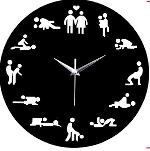 A black and white clock face featuring a variety of icons representing different human activities, such as sports, yoga, and various forms of exercise. The clock has a classic design with Roman numerals and is set against a plain background. The symbols are stylized and simple, conveying a sense of movement and activity.