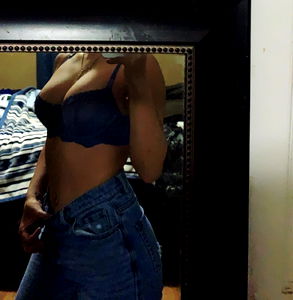 A young woman posing confidently for a mirror selfie. Wearing denim jeans, she showcases her curves and style.