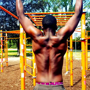 This image captures a shirtless man posing confidently with a towel wrapped around his neck. He stands amidst a park setting, with a playground and trees visible in the background. The man is looking directly at the camera, creating an engaging portrait. His posture and attire suggest he's either just finished a workout or preparing to cool down.