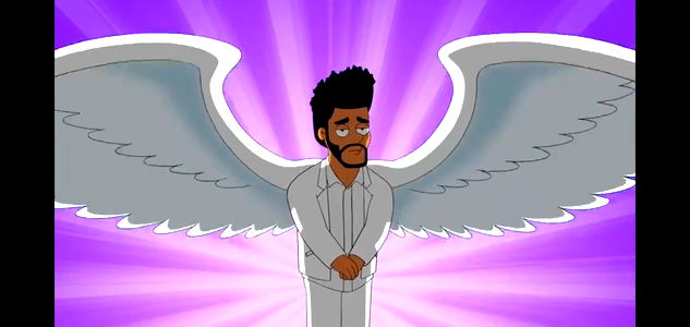 Helios is captured in a moment of rest, lying down and looking up with a thoughtful expression. His glasses reflect the ambient light in the room.