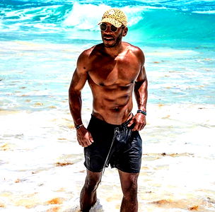 A shirtless male model with athletic build, posing confidently in front of mirror. His physique suggests dedication to fitness and he appears to be a professional or high-end model.