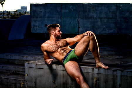 TheGayGaston strikes a confident pose, showcasing his athletic build. In this vibrant scene, he's captured in a moment of relaxation on a rustic wooden platform. His attire, the colorful undersuit paired with boxer shorts, adds to the dynamic composition. The backdrop is an urban setting, providing a stark contrast to his casual pose.