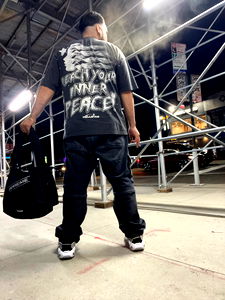 A person with a guitar case, standing confidently on the street at night. They appear to be preparing for or finishing a performance, as indicated by the 'Keep Peace' message on their shirt.