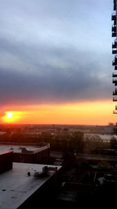 A captivating image of a cityscape at sunset, taken from an elevated perspective. The warm hues of the sky and the distant horizon create a peaceful and serene atmosphere.
