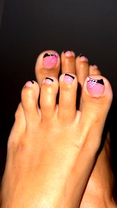 A young woman in her late teens or early twenties proudly showcases her vibrant toenail art, including black tips. She is an OnlyFans model from LA.