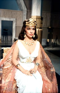 A vintage photograph of a classic old Hollywood glamour model from the 1950s era, seated in an elegant setting with elaborate costume and accessories.