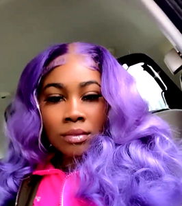 This image features an individual with striking purple hair, styled in voluminous waves. The person is seen posing in a vehicle, appearing confident and stylish. They are wearing a pink jacket that adds a pop of color to the overall look. Onlyfans model name: TheyH8_Gorgeousness