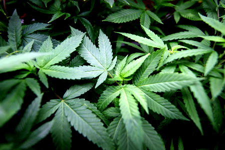 Close-up of green cannabis plants with abundant leaves and visible buds, set against an indoor light source.