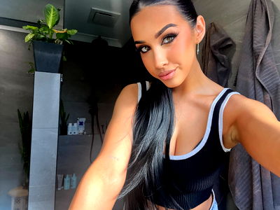 A striking image of Scarlett, an OnlyFans model from Western Australia. She is posing confidently in a bathroom setting with long hair and striking makeup. She's wearing a black tank top that showcases her physique. The bathroom has a sleek design with grey tiles and a potted plant adding a touch of greenery to the scene.