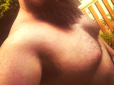 OnlyFans model Thor is seen shirtless in this image, showcasing his physique. He appears to be outdoors and relaxed, with a casual, laid-back vibe to the photograph. His beard adds a touch of ruggedness to the overall look.
