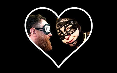 This image showcases a tender moment between Throatslave, the singer, and his soulmate. They are sharing a heartwarming kiss, creating an atmosphere of love and passion. The backdrop is black, putting the focus on their intimate exchange.