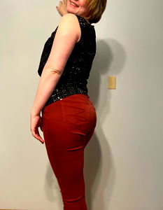 This image captures a full-length portrait of a woman, possibly in her twenties or thirties, who has a casual yet stylish air about her. Her ensemble consists of an outfit that appears to be carefully curated for a laid-back, chic look. She's dressed in what seems to be a pair of denim trousers, a popular choice for casual wear known for its durability and timeless appeal. The trousers fit her well, hugging her waist comfortably and accentuating her figure. The woman's top isn't visible in the image, but you can see the area from her waist up to her shoulders, suggesting she might be wearing a top or blouse. Her shoulder and elbow also indicate the possibility of her arm being bent, maybe placed on her hip or holding something out of view. Her casual dress suggests she might be out for a day of errands or a casual meet-up. She could also be a girl in her late teens, owing to her youthful style. Her attire and the overall image give off a vibe of relaxed elegance.