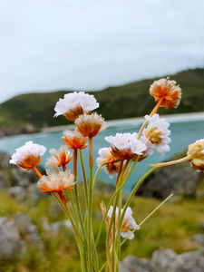 A tranquil beach scene featuring a cluster of wildflowers, possibly sea lavender or dainty yellow ones, and the vast expanse of a coastal shore under a clear sky. The flowers are in full bloom, indicating the photo might have been taken during the spring season when such plants typically thrive.