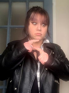 A woman stands confidently, gesturing with one hand while wearing a leather jacket. She has short hair and her facial expression is one of mild amusement or surprise.