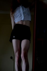 This is an image of a person, identified as a model from OnlyFans. The individual appears to be posing for a photo, standing in front of a mirror. They are wearing tight-fitting swimwear and seem to be capturing their reflection. Their expression suggests that they might be tired or contemplating something. The background is minimalistic with a light source casting shadows, indicating an indoor setting.