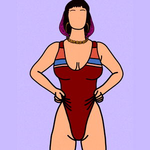 This is an illustration of a model wearing a red one-piece swimsuit. The character has short hair, and the style appears to be a parody or stylized version of a fitness model. The background is plain and does not provide any additional context or setting.